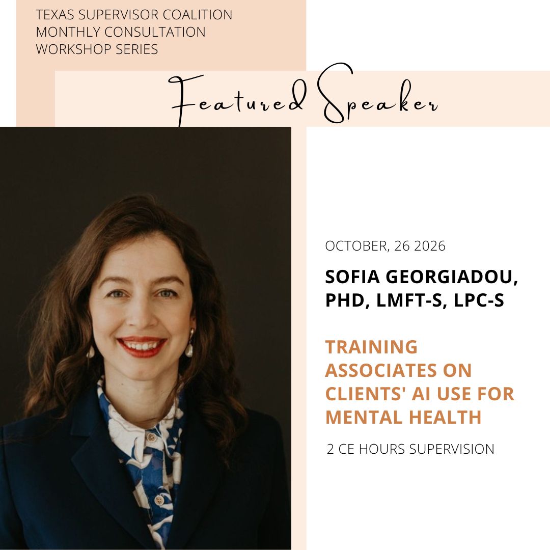Dr. Georgiadou will be presenting the latest information on supervising associates around ethical and effective responses to clients’ use of AI in mental health while answering your questions. 2 CEs Supervision for Counselors, MFTs, and Social Workers.