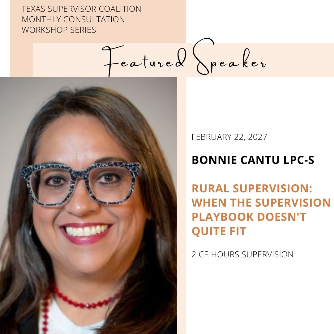 Bonnie Cantu LPC-S will be presenting the latest information on adapting supervision practices to meet the unique challenges of rural settings while answering your questions. 2 CEs Supervision for Counselors, MFTs, and Social Workers.