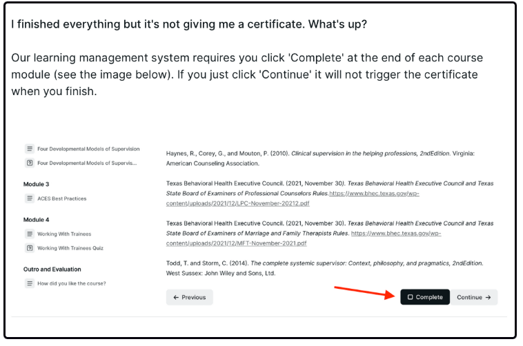 When you finish the course material, you will see a certificate of completion in your online profile. If you are using the documentation for your licensing board, you will need something documenting specific hours and topics.